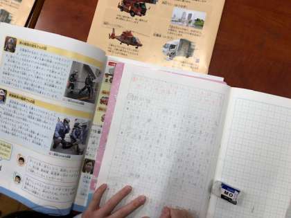 3年社会では、身のまわりのさまざまな施設やそこでの仕事に目を向け学習をします。今回のテーマは、消防署。リーフレットや教科書を使って調べました。ただ書き写すのではなく、カテゴリー分けをしてわかりやすくまとめたり、まとめたことから考えたことをまとめたりする姿がみられました。