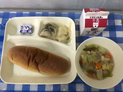 今日の給食は、あじのレモンマリネ、てぼ豆のスープ煮、固形チーズ、黒糖パン、牛乳です。献立のマリネは、油で揚げたあじに、酢やレモン汁で作ったマリネ液をかけています。少し酸っぱいかと思いましたが、子ども達はよく食べていました。「今日の給食おいしかったです。」と給食室に向かって元気よく挨拶をしていました。