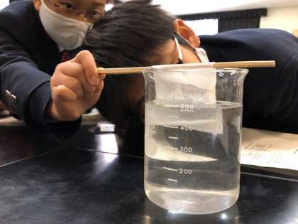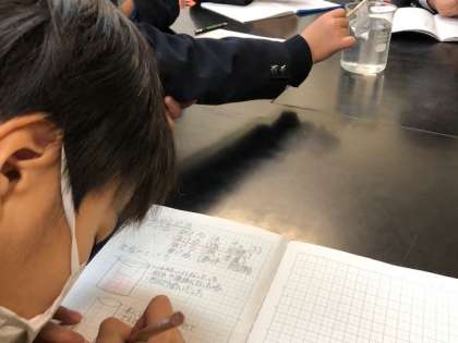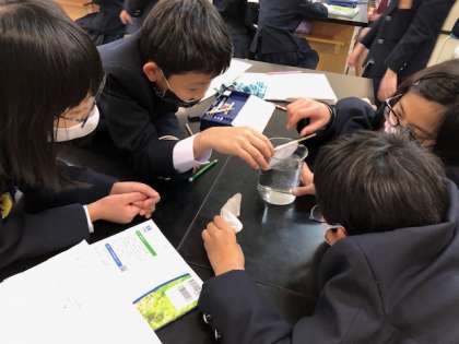 ビーカーに食塩を入れ、どのように溶けていくか観察しました。みつけたことを言葉とイラストでわかりやすくノートにまとめ、気づいたことを交流していくことができました。