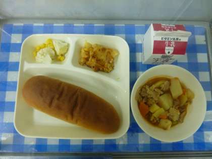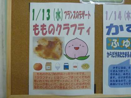 今日の給食は、豚肉と野菜のケチャップ煮、カリフラワーのピクルス、桃のクラフティ、黒糖パン、牛乳です。カリフラワーは、冬が旬の食べ物で、ビタミンCが多いのが特徴です。クラフティは、フランスの焼き菓子で、8月のりんごのクラフティに続いて今年度は2回目の登場です。前回は、1年生が初めてのクラフティで、「この料理は何ですか?」と果物に火を通したデザートに対する抵抗があったようですが、今回は随分と慣れてきたようでした。外国にも様々な料理があることを知ってほしいと思います。