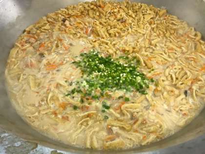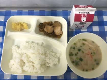 今日の給食は、鶏肉の甘辛焼き、かす汁、くりきんとん、ごはん、牛乳です。かす汁は、酒かすを入れた具だくさんの汁ものです。子ども達にも食べやすいように赤みそ、白みそでも味つけしています。くりきんとんは、正月のおせち料理で、漢字で「金団」と書くことから、お金がたまりますようにという願いを込めて食べます。どのクラスもとてもよく食べ、「今日の給食おいしかったです。」とたくさんの子ども達が給食室に言いにきてくれました。