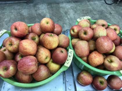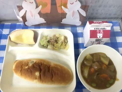 今日の給食は、ミートボールと野菜のカレー煮、ツナとキャベツのソテー、りんご、おさつパン、牛乳です。カレー煮には、ラッキーにんじんが入っていました。今日のりんごは、青森県産の太陽ふじという品種です。葉をとらず、袋もかけず栽培します。味が濃く、皮がうすくてまだら模様になり、甘いのが特徴だそうです。給食にもいろいろな品種のりんごが登場します。味わって食べてほしいです。