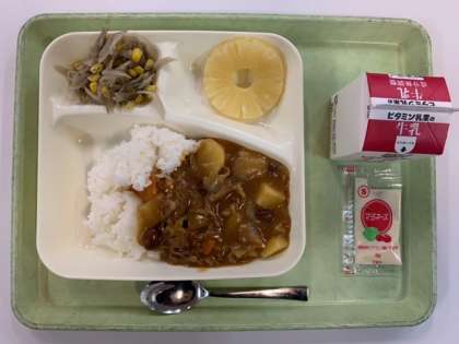 今日の給食は、牛肉と金時豆のカレーライス、ごぼうサラダ、パインアップル(缶)、牛乳です。カレーライスにはラッキーにんじんが入っていました。また、カレーライスに使われていた牛肉は、近江牛(おうみうし)です。これは、新型コロナウイルス感染拡大のため、需要が減少し、深刻な影響が生じている和牛や国産水産物を学校給食に活用しようという事業のものです。脂がのっていて甘味のあるおいしい牛肉でした。子ども達はとてもよく食べ、残食もありませんでした。