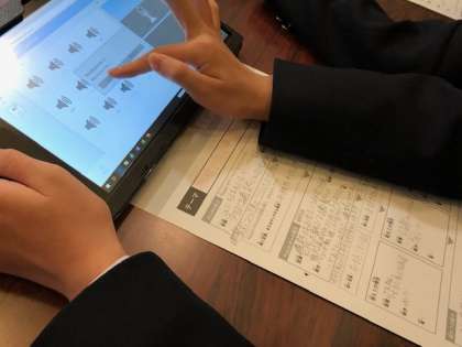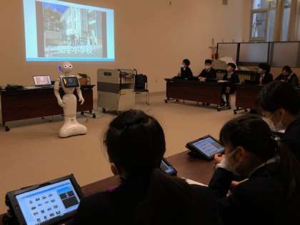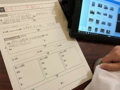今日から、本年度後期のPepperとのプログラミング学習が始まりました。6年生は、これまでの生活科や総合で見つけてきた船場のよさを伝える方法を考えています。前期にならった「画像や文字を提示する機能」「音センサー」「タッチセンサー」「言葉をしゃべる機能」を組み合わせて、わかりやすく伝える方法を考えていっています。