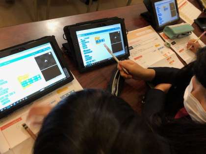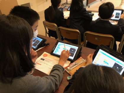 5年では、算数の学習の中でプログラミング学習に取り組んでいます。さまざまな正多角形の規則性をみつけ、Pepperを動かして正多角形を描く方法を考えました。辺の数、内角の和、外角の大きさなどに着目し、正多角形をかくためのプログラムを考えることができました。