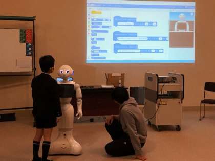 3年プログラミング学習では、タッチセンサーを使って、学校や船場のクイズづくりをしています。2学期に学習した、動作やしゃべるブロックと組み合わせたり、新たに画像を組み合わせたりすることで、より楽しいクイズになるように工夫していっています。