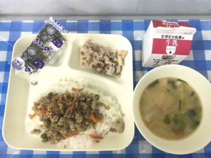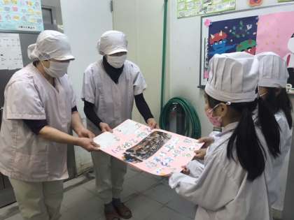 今日の給食は、鶏ごぼうごはん、みそ汁、焼きれんこん、牛乳です。今日から2月の給食がスタートしました。鶏ごぼうごはんのごぼうやこんにゃく、焼きれんこんのれんこんは食物繊維が豊富で、お腹の調子を整えます。今日も、子ども達が給食調理員さんに寄せ書きのプレゼントを持ってきてくれました。それぞれの好きな給食のメニューを絵で描いて、とても工夫されたものでした。
