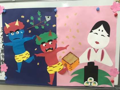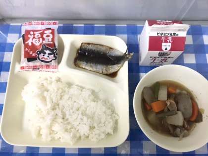 今日の給食は、いわしのしょうがじょうゆかけ、含め煮、いり大豆、ごはん、牛乳です。これは、節分の行事献立です。昨日、2月2日が節分でした。鬼の嫌いないわしをオーブンで焼き、しょうがじょうゆのたれをかけたもの、病気や悪い出来事を追い払うために豆まきをしたり、歳の数だけ食べたりする炒った大豆が出ました。節分のように、昔から伝わる風習を家庭でも学校でも大切にしていきたいです。