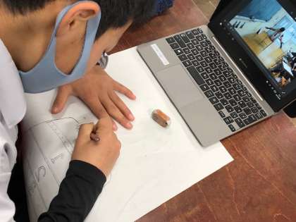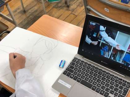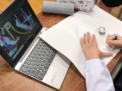 6年生は、自分が一番輝いている一瞬を版画で表現します。タブレット端末を活用し、まずは下絵づくりです。力強さ、頑張りをどのようにすれば伝えられるか、きりとる一瞬にこだわりつくっていっています。