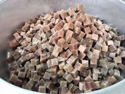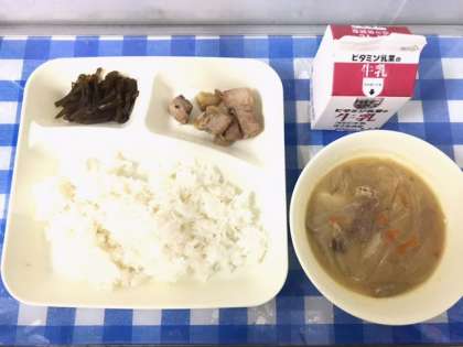 今日の給食は、まぐろの甘辛焼き、豚汁、くきわかめのつくだ煮、ごはん、牛乳です。まぐろは砂糖じょうゆで下味をつけ、白ねぎと一緒にスチームコンベクションオーブンで焼いています。つくだ煮は、わかめの葉の芯の部分で、コリコリとした歯応えが特徴です。ごはんが進む一品でした。