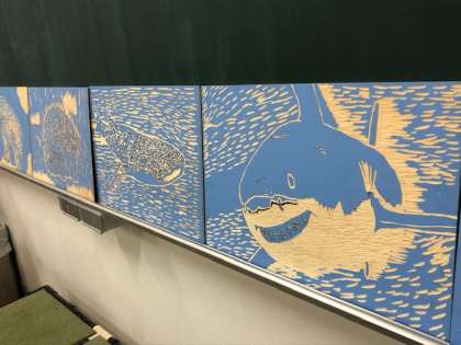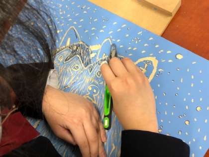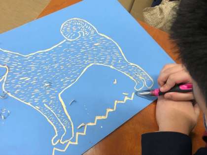 4年図工では、動物の特徴を活かした木版画に取り組んでいます。目・鼻・口・ひげなどの「しっかりと表したい線」と、毛並みや模様などの「細い線」を区別してほることで、動物の質感を表現できるように工夫しています。彫刻刀を初めて使う4年生。下絵から、イメージをしっかりと広げ、彫り進めています。