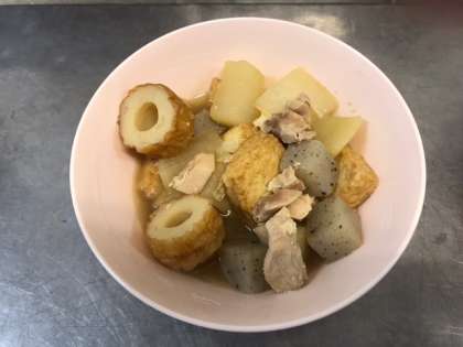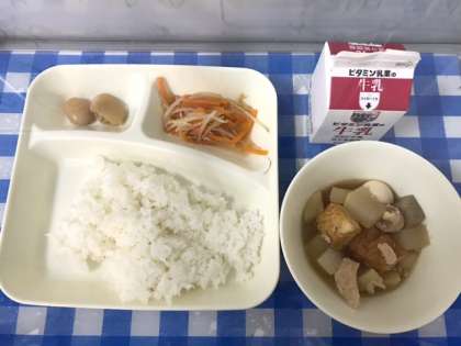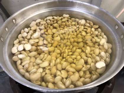 今日の給食は、関東煮、甘酢あえ、白花豆の煮もの、ごはん、牛乳です。関東煮は、うずら卵の個別対応献立です。うずら卵を入れない関東煮を給食室で調理し、ピンクのお椀に入れて渡します。白花豆は、いんげん豆の仲間です。熱湯に30分以上浸し、60分間以上コトコト煮含めて作ります。豆料理はとても時間がかかる調理です。