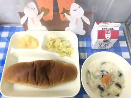 今日の給食は、ほうれんそうのクリームシチュー、キャベツのサラダ、洋なし(缶)、黒糖パン、牛乳です。ほうれんそうは、冬が旬の食べ物で、11月から4月にかけてが一番よく収穫できます。ビタミンなどの栄養価も旬の時期の方が3倍高いことが検証されています。子ども達が楽しみにしているラッキー人参も入っていました。