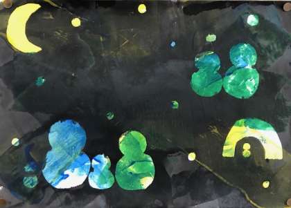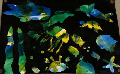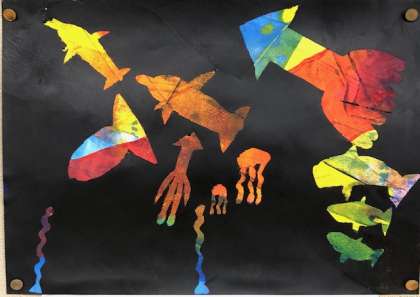 2年図工では、2種類の版画にチャレンジします。今日は、ローラー版画に取り組みました。さまざまな色の絵の具をつかってローラーで描いた上にシールを貼り、黒の絵の具をローラーで重ねます。シールをはがすと、「海の中の生き物たち」「光る雪だるま」「海の楽園」など、すてきな世界が完成しました。