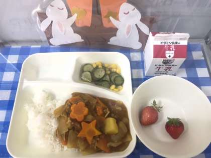 今日の給食は、ポークカレーライス、きゅうりとコーンのサラダ、いちご、牛乳です。カレーライスにはラッキーにんじんが入っていました。いちごは、長崎県産の「恋みのり」という品種です。2016年に出願登録されたばかりの新しい品種だそうです。粒の大きいものが多く、香りが豊かなことが特徴です。子ども達は、いちごをとても貴重だと思っているようで、大切に大切に食べていました。