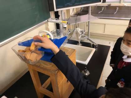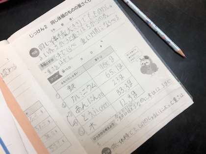3年理科では、同じ体積のものの重さについて考えました。木やアルミニウム、鉄など、同じ体積のブロックのそれぞれの重さを比べると、体積は同じなのに重さは全然違うことに気付くことができました。他にもどんなものがどれぐらいちがうのだろうと、考えを広げていく子どもたちの姿がみられました。是非、自学ノートなどでチャレンジしてほしいと思います。