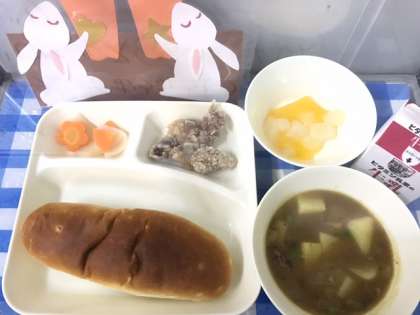 今日の給食は、フライドチキン、カレーシチュー(近江牛)、おいわいピクルス、フルーツゼリー、おさつパン、牛乳です。この献立は、卒業祝い献立です。フライドチキンは大好評で、おかわりもたくさんしていました。カレーシチューは、近江牛が使われていたので、牛肉のうま味が出て濃厚な味でした。おいわいピクルスは、だいこんとにんじんの紅白でお祝いらしく、さらに、ラッキー人参も入っていたので、楽しみが増えました。フルーツゼリーは新メニューで、こちらも子ども達に大好評でした。「おかわりじゃんけんで負けておかわりができなかった。」と残念がっている児童もいました。給食を返しにきた時に「今日の給食、めっちゃおいしかったです!!」と口々に伝えてくれました。6年生も、調理室の中をのぞきこんで、「おいしかったです。」と給食調理員さんに伝えてくれました。みんなが笑顔になった大満足の卒業祝い献立でした。