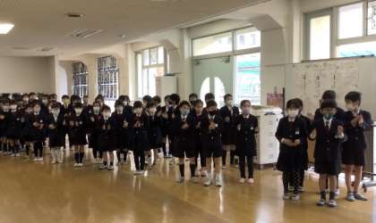2年生からは、ボディーパーカッションによる「手拍子の花束」を送りました。