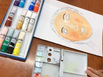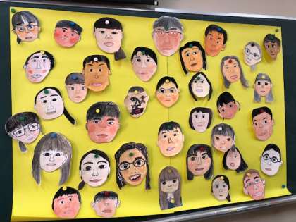 5年図工では、1年間の学習を活かして「自分の顔」を描きました。ペンで描く時のコツ、絵の具の色づくり・筆の使い方のコツを活かして描いていきました。