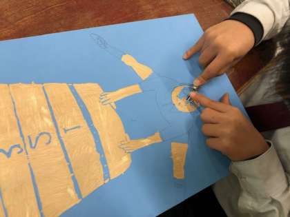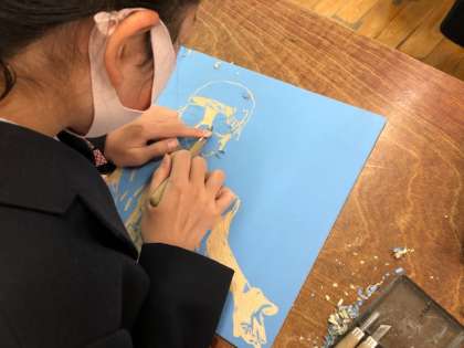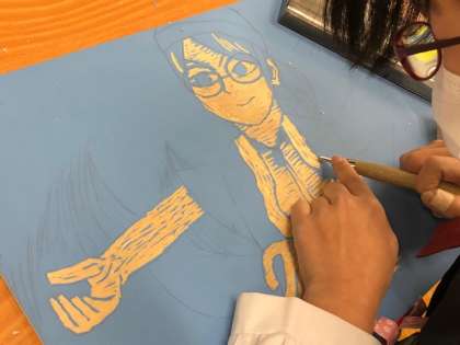 6年図工では、自分の輝いている一瞬を版画で表現しています。顔の表情がより輝くような彫り方、躍動感を感じられる彫り方などを考えながら進めて行っています。