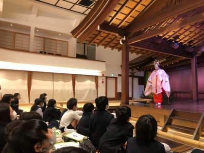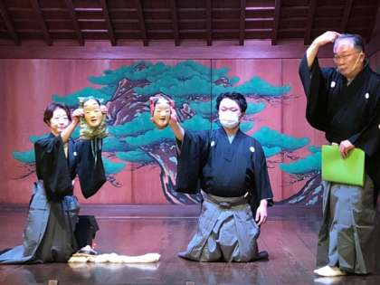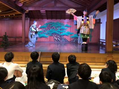 今日は、音楽の学習と関連して、能・狂言に関わるお仕事に触れました。「謡い」「楽器(囃子)」「舞」「面」など、楽しく観る視点を教えていただき、実際にみせていただきました。お話がはじまると、みんな食い入るように、能・狂言の世界にひきこまれていました。