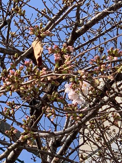 明後日の卒業式を祝う桜の開花が始まりました。