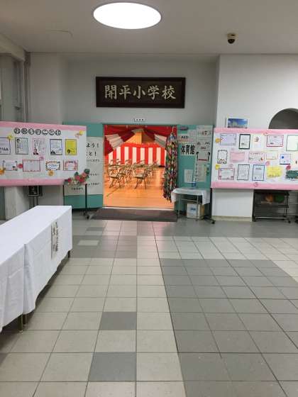 明日は待ちに待った入学式です。新入生を迎えるための体育館準備も整いました。
