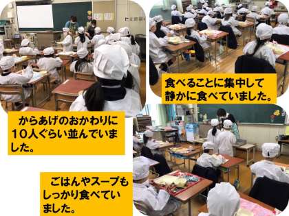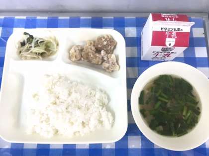 今日の給食は、からあげ、中華スープ、チンゲンサイともやしの甘酢あえ、ごはん、牛乳です。からあげは大人気で、おかわりに何人もの子ども達が並んでいました。給食を食べている時は、食べることに集中して静かに味わって食べていました。給食を給食室に返しにきた時に、「からあげがめちゃくちゃおいしかったです。」と伝えてくれました。毎日、給食がおいしいと笑顔で返しにくる子ども達の姿を見ることができて、とてもうれしく感じています。