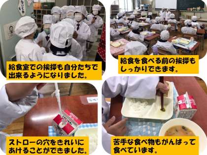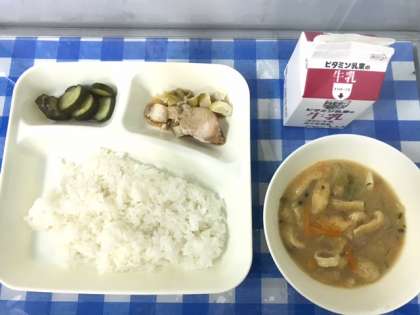 今日の給食は、焼きとり、みそ汁、きゅうりのゆず風味、ごはん、牛乳です。1年生が給食を食べるようになって1週間が過ぎました。今までは先生の後に続いて言っていた挨拶も、自分達で考えて思い出しながら言うことができるようになってきました。今日は、きゅうりのゆず風味が苦手という児童がいました。様子を見ていると、一口ずつがんばって食べて、全部食べ終わることができていました。