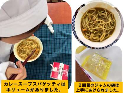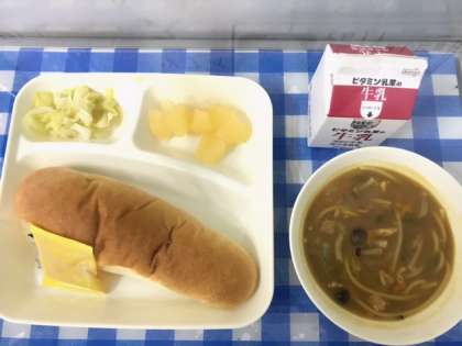 今日の給食は、カレースープスパゲッティ、キャベツのピクルス、りんご(缶)、コッペパン、アプリコットジャム、牛乳です。カレースープスパゲッティは、ボリュームがあり、1人当たり220ml程度ありました。食べることができるかなと心配でしたが、どのクラスも「カレーうどんおかわりする。」「カレーラーメンおいしい。」とおいしく食べている様子が見られました。本当のメニュー名はカレースープスパゲッティですが、子ども達がそれぞれ違う名前で呼んでいる声を聞いて、思わず笑ってしまい、ほっこりしました。1年生も前回のいちごジャムに続いて2回目のジャムで、前回よりジャムの袋をあけるのが上手になっていました。