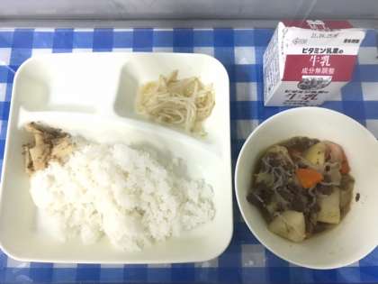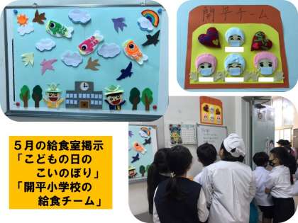 今日の給食は、肉じゃが、もやしのゆずの香あえ、ごまかかいため、ごはん、牛乳です。ゴールデンウイークあけで久しぶりの給食ですが、各教室で静かに味わって食べていました。5月の給食室の掲示は、こどもの日のこいのぼりです。本校の給食調理員さんがフェルトで手作りしてくれました。また、今年度の給食に携わる給食メンバーの似顔絵もフェルトで作り、掲示されていました。子ども達は、新しい掲示を興味津津で見ていました。本校では、約370人分の給食を3人の給食調理員さんによって作られています。自分たちが日頃食べている給食が、どのように作られているのかを考える機会にしてほしいです。