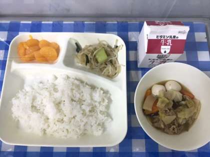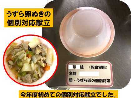 今日の給食は、八宝菜、チンゲンサイともやしのしょうがあえ、みかん(缶)、ごはん、牛乳です。八宝菜は、うずら卵の個別対応献立です。給食室でうずら卵の入っていない八宝菜を準備し、担任の先生を通じて対象児童に渡しています。間違って渡してしまうことがないように、食札を使っています。わかりやすくピンク色の食器に入っています。教室では、卵にアレルギーがある子ども達も八宝菜をしっかり食べていました。