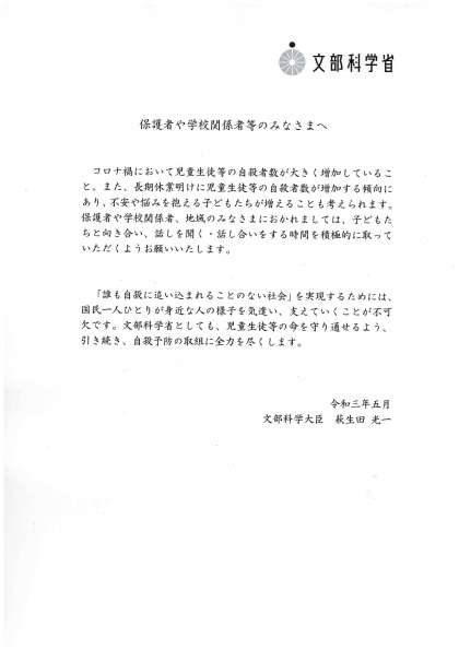 5月11日「児童生徒等に向けた自殺予防に係る文部科学大臣のメッセージ」