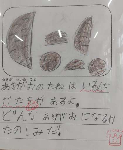 1年生の生活科では、2年生からもらったアサガオの種を観察しました。