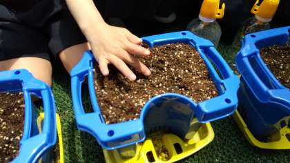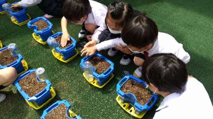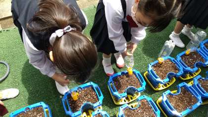 1年生、一人一人が自分の鉢にアサガオの種を植えました。友達どうしで植えかたを教え合いながら、一粒一粒丁寧に植えることができました。