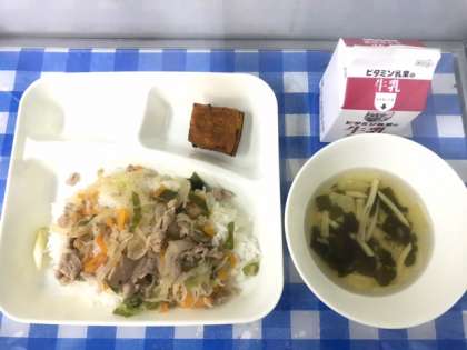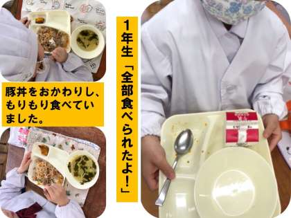 今日の給食は、豚丼、湯葉のすまし汁、かぼちゃのしょうゆ焼き、牛乳です。豚丼は、豚肉や糸こんにゃく、たまねぎ、にんじん、青ねぎなどが入った丼です。とても好評で、子ども達はもりもり食べていました。給食が始まって1か月が過ぎ、最初は少ししか食べられなかったり、初めてのメニューに苦戦したりしていた1年生も、少しずつ全部食べられるようになってきました。「3日間続けて全部食べられたよ!!」などと知らせてくれています。