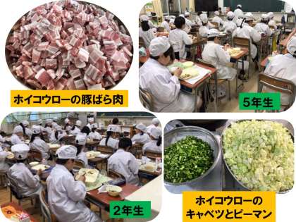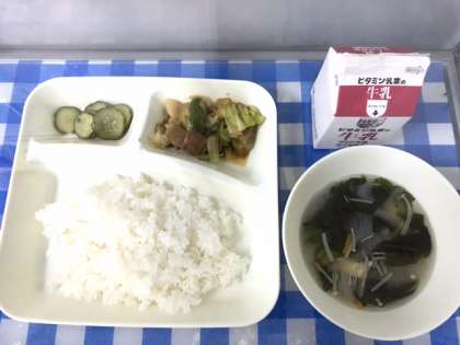 今日の給食は、ホイコウロー、中華スープ、きゅうりのピリ辛あえ、ごはん、牛乳です。ホイコウローは、中国の四川料理の一つで、豚肉とキャベツのいためもののことです。味つけにテンメンジャンを使っています。今日は、久しぶりに全児童が1時間目から登校する日でした。給食を給食室に返しにきた時に「今日のホイコウローおいしかったです。」「いつもおいしい給食を作ってくれてありがとうございます。」「給食は温かくていつもおいしいです。」など、給食室に向かって挨拶をする子ども達の姿があり、やっといつもの本校の給食の風景が戻ってきたなぁと感じました。