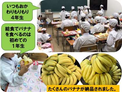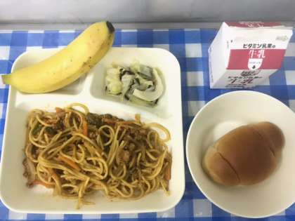 今日の給食は、カレースパゲッティ、キャベツのひじきドレッシング、バナナ、黒糖パン(小)、牛乳です。スパゲッティは、カレールウの素やカレー粉で味つけしています。とても人気があり、たくさんおかわりをしていました。バナナは、給食では2年ぶりの登場です。昨年は、5月が臨時休校だったのでバナナが登場する機会がありませんでした。久しぶりの給食でのバナナに、大喜びの子ども達でした。給食室でも「やったー。バナナ大好き!」、「バナナいっぱい食べたい!!」などの声が聞かれ、教室では「バナナがおいしかったから今日はすぐに食べ終わった!!」などの感想が出ていました。大満足の給食でした。