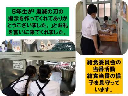 今日の給食は、鶏肉のおろしじょうゆかけ、みそ汁、野菜いため、ごはん、牛乳です。給食委員会の活動として、毎日、返却時に給食室に立って、給食当番が丁寧に決まりを守って給食を返すことができているか見守り、声かけをしています。給食室に立って給食当番の様子を見ることで課題に気がつくことができます。その課題をクラスや学校全体に発信して、より良い方向に進んでいくことが大切です。先週から、給食室の掲示が鬼滅の刃に変わり、毎日給食当番の児童が目を輝かせて給食を取りに来ています。「鬼滅が好きだからとてもうれしい。」「伊之助がいる!!」「時透が大好き!!」など、喜んで給食室に来ています。今日は、作製した給食調理員さんに5年生がお礼を言いに来ていました。