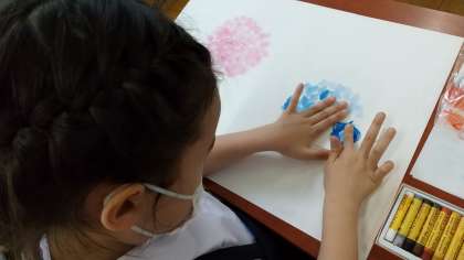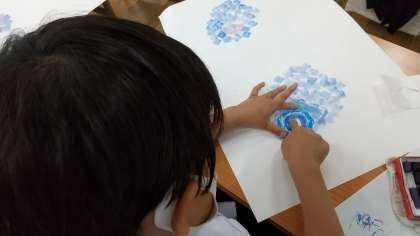 1年生の図工では、画用紙で作った四角い型の上でパスをこするステンシルの技法をつかって、淡く美しいあじさいをかきました。
