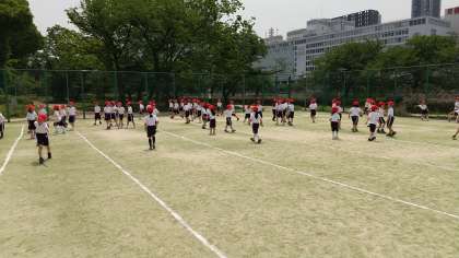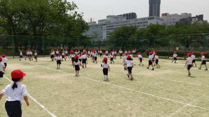 かけっこの次に、歩き鬼ごっこをしました。たくさんの仲間の中からペアの友達を見つけてタッチします。早足で歩くというルールを守って楽しく取り組めました。