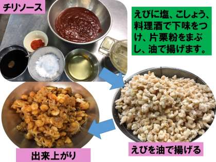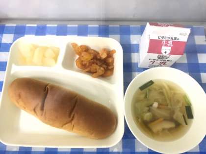 今日の給食は、えびのチリソース、中華スープ、和なし(缶)、黒糖パン、牛乳です。えびのチリソースは、下味をつけて油で揚げたえびにチリソースをかけます。しょうがやにんにく、トウバンジャンなどで作ったソースの香りがよく、食欲がわく一品でした。和なし(缶)は、幸水、豊水、二十世紀なしが入っていました。