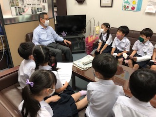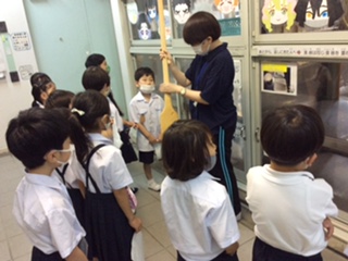 計画を立ててから少し時間がたっていましたが、学校の中のいろいろな部屋の様子や、そこにおられる先生について、聞きたいことを話し合って、見学とインタビューに行きました。この日は校長室、職員室、保健室、事務室、給食室にグループに分かれて行きました。子ども達は初めて見る部屋の様子に興味津々。質問にもたくさん答えていただきました。