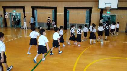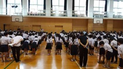 今朝は、1年半ぶりに全校朝会を行いました。1年半前より百人近く児童数が増えているので、列の向きを変え、できるだけ蜜を避けるようにしました。