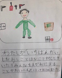 先週の学校探検に引き続き、管理作業員室にもインタビューに行き、聞いてきたことをワークシートにまとめました。その後、グループごとに見学した部屋について発表しました。自分が見学に行っていない場所についても、友達の発表を聞いて質問したことで、どのようなところだったのか、理解を深めることができました。