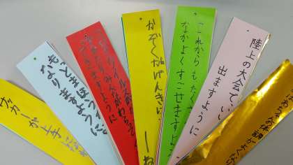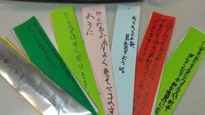 毎年参加している大阪取引所の七夕飾り。昨年は参加できませんでしたが、今年は一人一人が短冊に願い事を書きました。