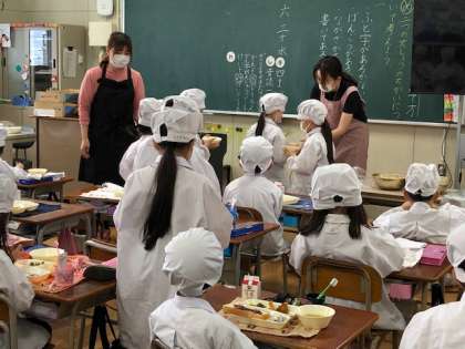 今日の給食は、鶏肉のカレーマヨネーズ焼き、てぼ豆のスープ、さんどまめとコーンのサラダ、食パン、ブルーベリージャム、牛乳です。カレーマヨネーズ焼きは、鶏肉にカレー粉やマヨネーズ、ケチャップなどで下味をつけ、オーブンで焼きます。タンドリーチキンのような味わいでした。さんどまめは、今の時期が旬です。生のさんどまめが新鮮で、かむと「キュッ、キュッ!!」といい音がしていました。子ども達は、おかわりをたくさんしていました。