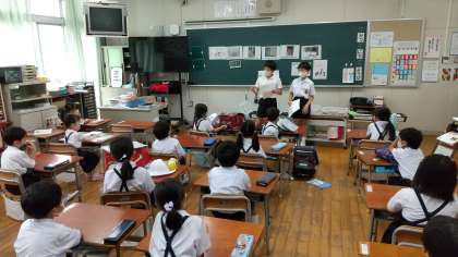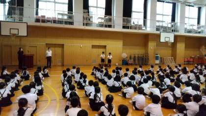 保健委員会は、絵を見せながら熱中症予防を呼びかけました。また、運営委員会は、新校舎の屋上と1階にできる広場の名称募集を呼びかけ、朝会後に各学級に説明に出向きました。