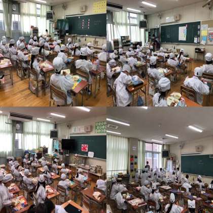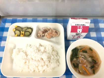 今日の給食は、鶏肉のからあげ、中華みそスープ、きゅうりとコーンの甘酢あえ、ごはん、牛乳です。鶏肉のからあげは大人気でした。2年生の教室では、7個のからあげをめぐって15人がおかわりをしたいと手をあげていました。スープは、豚骨スープと赤みそのスープです。甘酢あえは、さっぱりとしていて食べやすかったです。