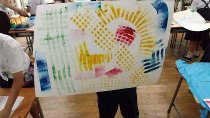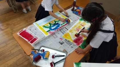 1年生の図工では、様々な大きさのローラーを転がしてできる模様を楽しみながら、思い思いに表現しました。あっちにコロコロ、こっちにコロコロ、画用紙いっぱいに描くことができました。